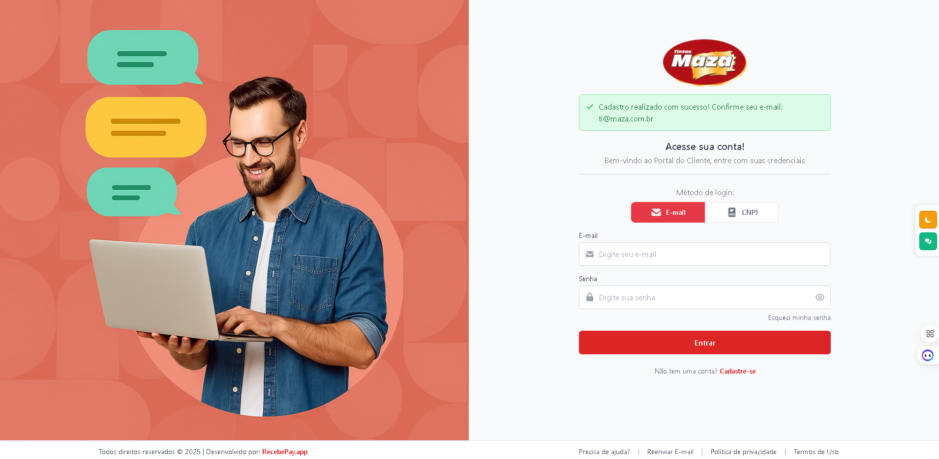 Após concluir o cadastro, uma mensagem será exibida informando que um e-mail de confirmação foi enviado para o endereço cadastrado internamente na Maza.